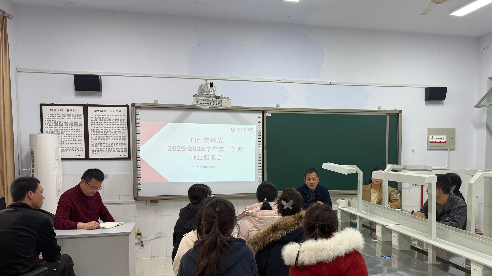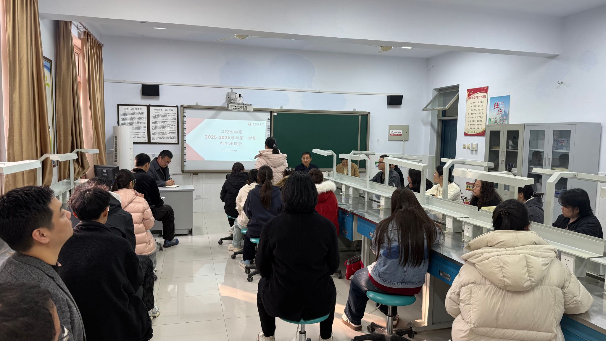 2025年10月28日下午3点,口腔医学系在4号楼107室召开2025-2026学年第一学期师生座谈会,会议由教学秘书魏江明主持。学校教学督导组专家杨敬改,口腔医学系党总支书记耿建春、副书记党莹、副主任董泽飞、全体教研室主任、辅导员及学生代表参加。